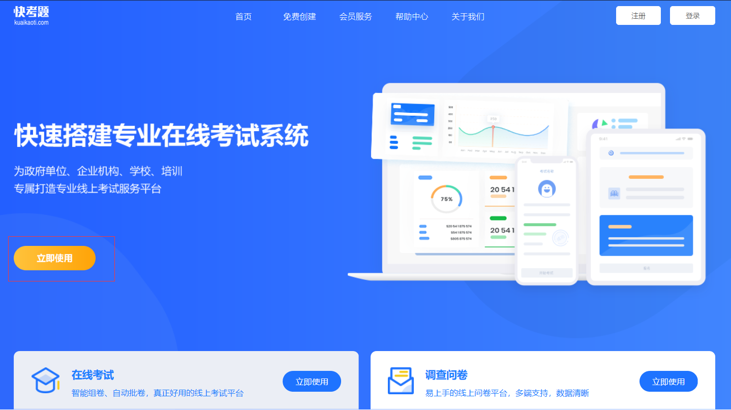 1、进入快考题官网,注册账号并登陆。点击“立即使用”开始创建在线考试。