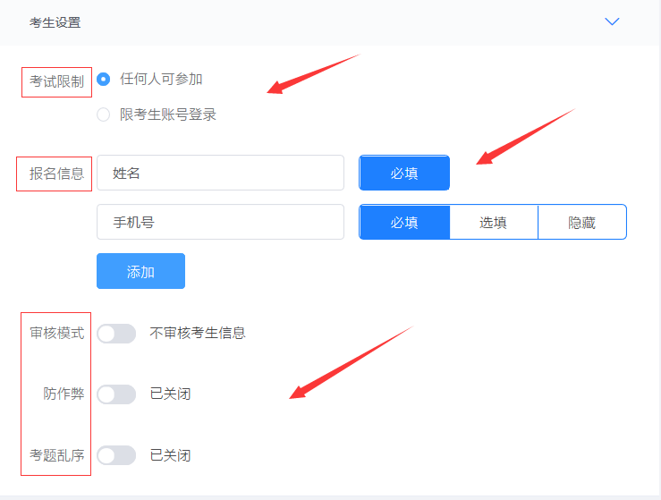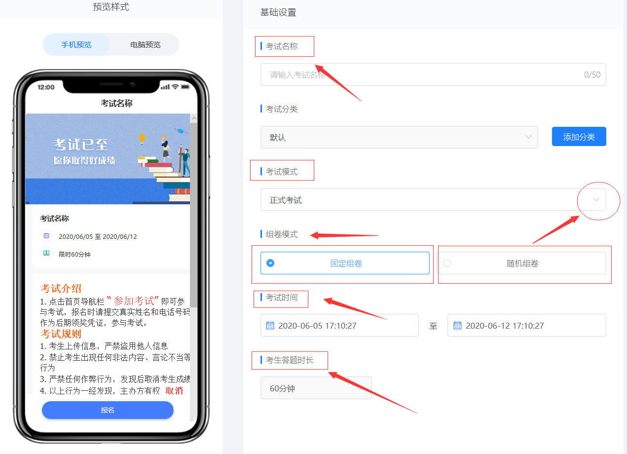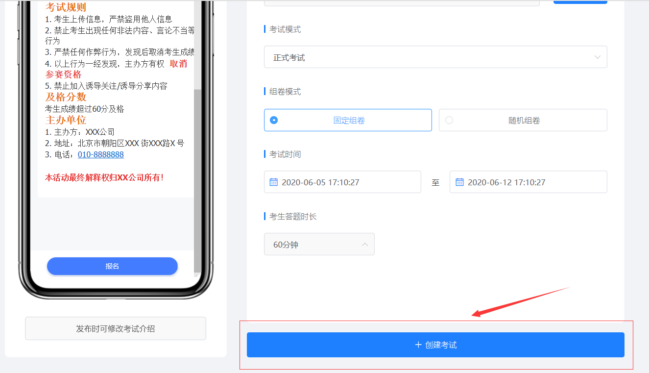 2、进入“创建考试”界面,填写考试名称,选择考试模式;