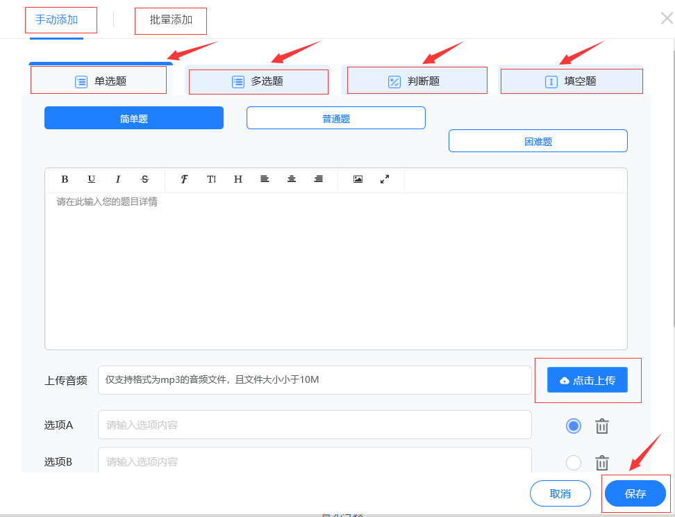 8、选择添加试题的类型,考题类型分为单选题;多选题;判断题;填空题,不定项、问答题六类题型。难易程度分为三种:简单题;普通题;困难题。编辑完试题后点击“保存”