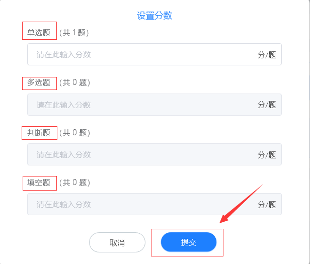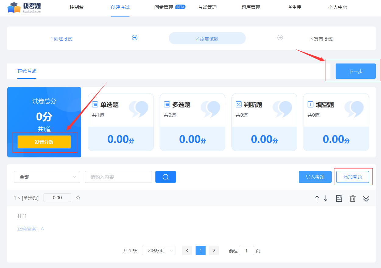 9、创建试题完毕后,点击设置分数,对各题型分别设置分值,设置完毕后点击“提交”,然后点击右上方的“下一步”