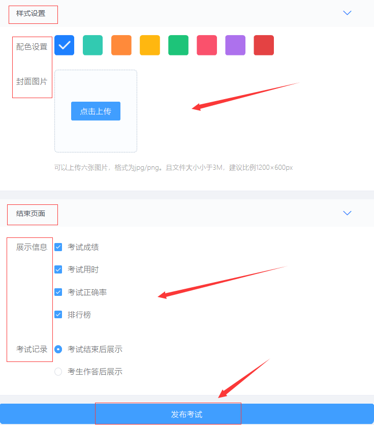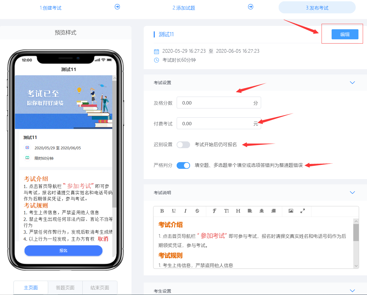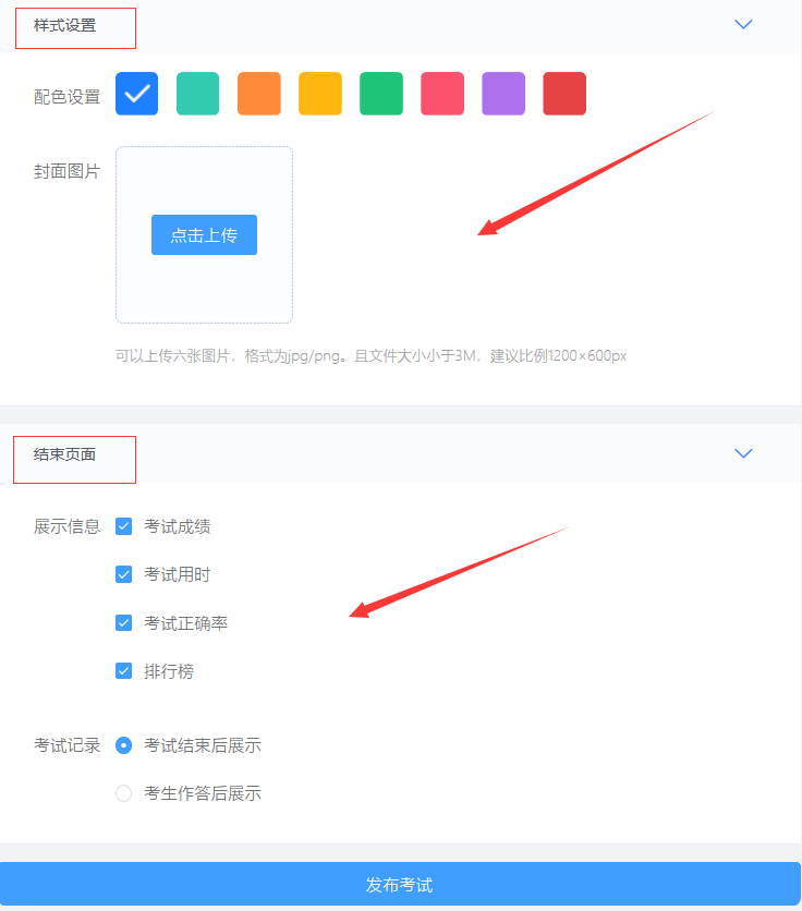 10、进入“发布考试”页面,选择及格分数,是否付费,填写考试说明以及考试限制,可在页面左侧实时预览主页面、答题页面、结束页面,也可直接选择存为草稿,或是直接发布,鼠标下拉完成考生设置,在样式版块中选择主题颜色以及上传封面,设置结尾页面的信息后,点击发布考试即可完成。
