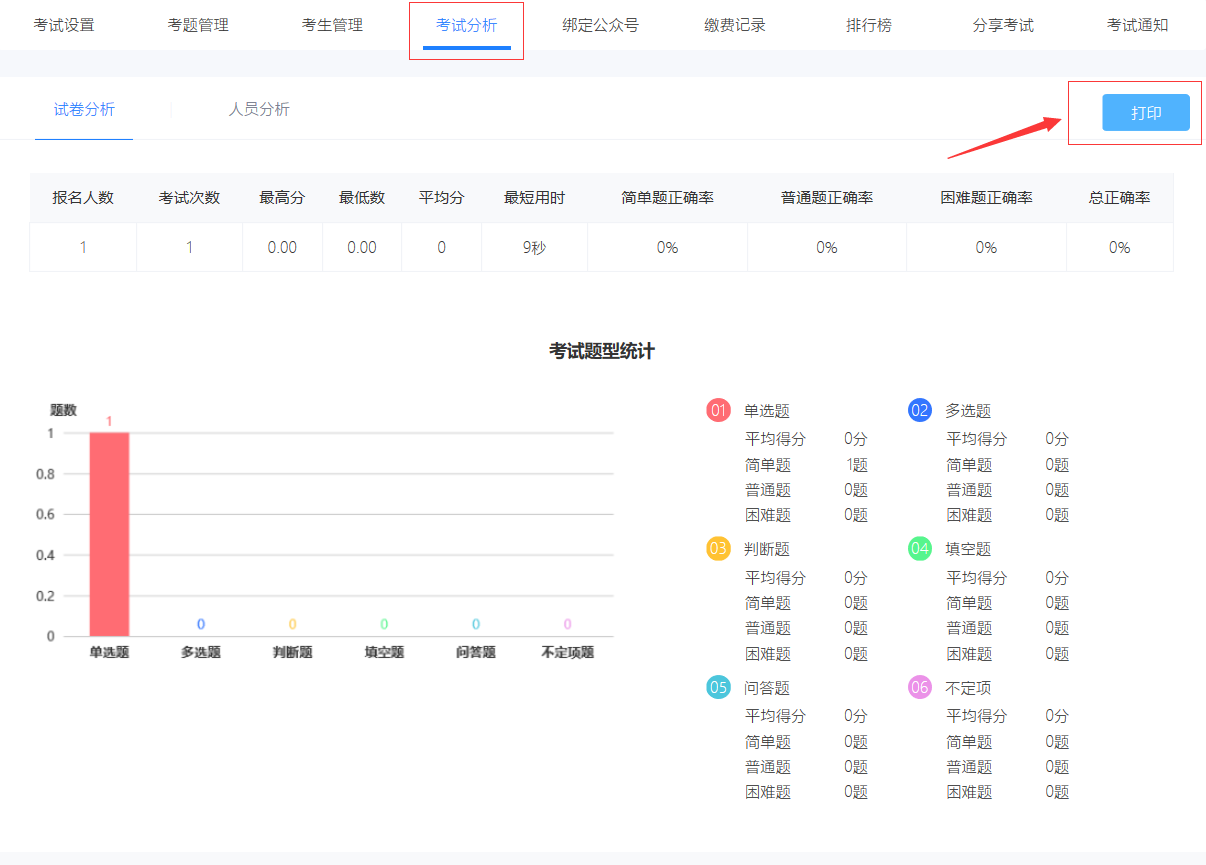 考试创建完成后,点击“考试”,点击更多,选择“考试分析”即可查看考试分析及考试记录。点开“考试分析”,再选择右上角“打印”即可。