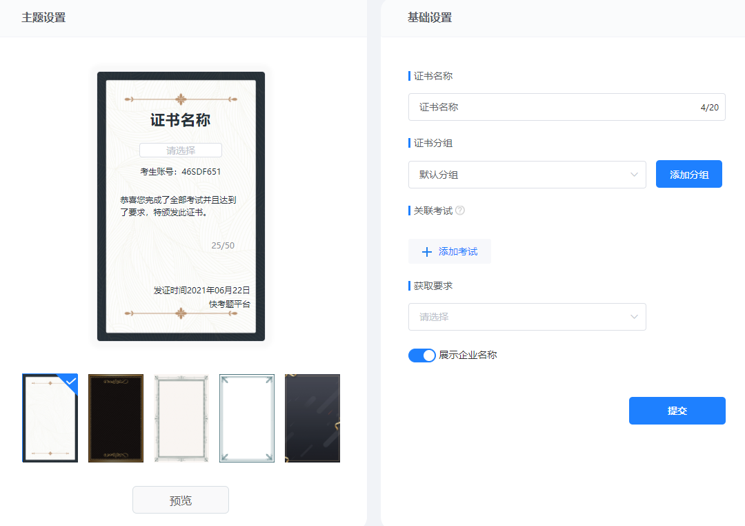 4、根据弹窗内容,选择主题模板,填写证书名称、证书分组、关联考试、获奖要求、是否展示企业名称,点击提交即可。