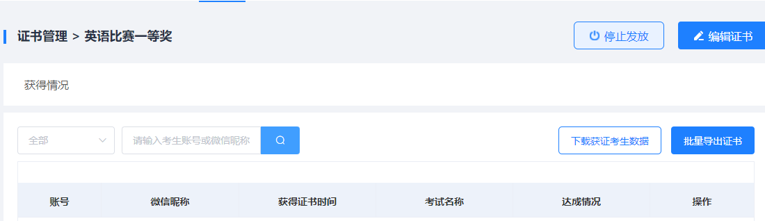 5、创建成功之后,点击证书管理,可以选择停止发放、编辑证书选项,还可以查看获奖人员情况,还可以下载获证考生数据,批量导出证书。