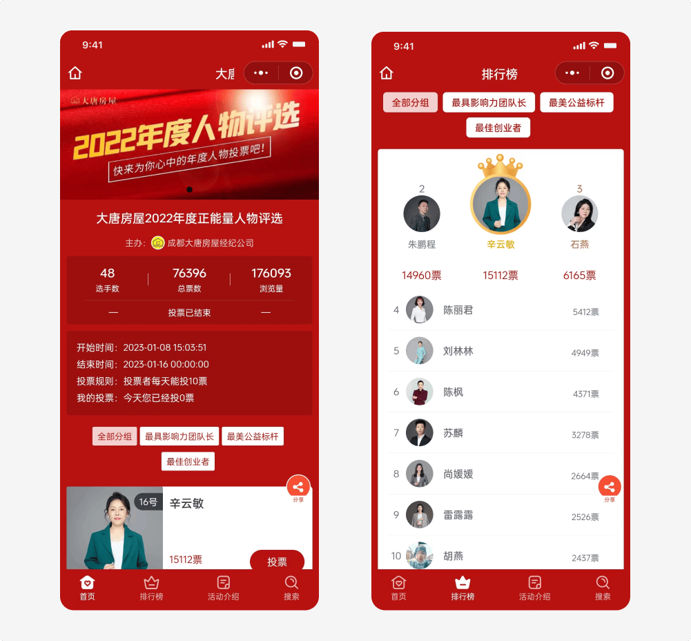 案例一:成都大唐房屋经纪公司举办了大唐房屋2022年度正能量人物评选投票活动,在活动举办期间,浏览量达到了123万,参与量都达到9.9万。