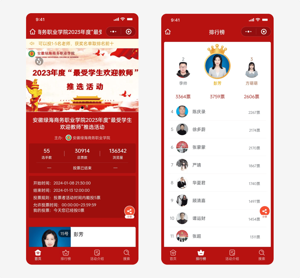 案例二:安徽绿海商务职业学院举办了安徽绿海商务职业学院2023年度“最受学生欢迎教师”推选活动评选投票活动,在活动举办期间,浏览量达到了3万,浏览量达到了13.6万。