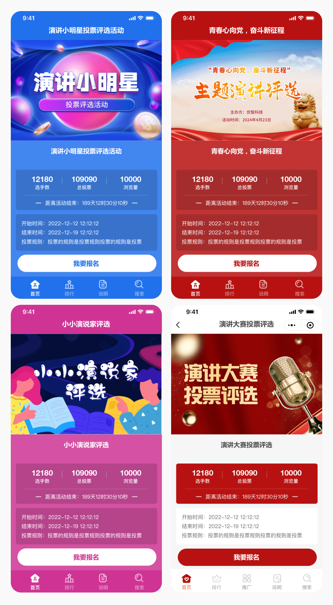 上面4套主题适合演说演讲大赛评选活动的方案,同时也可以找到客服帮您制作好看的封面来适合更多的演说演讲的相关评选活动方案。