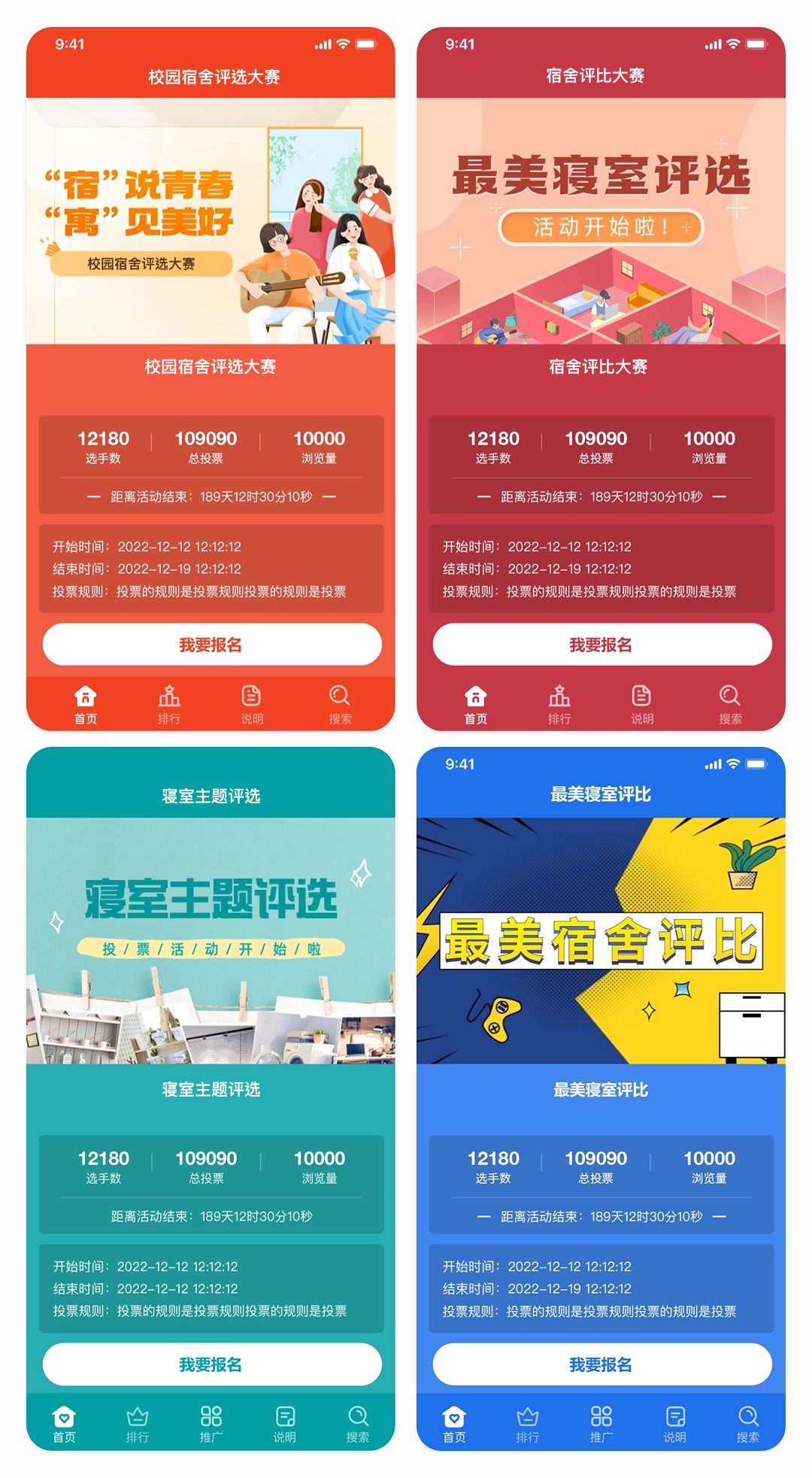 上面4套主题适合校园宿舍评选大赛方案,同时也可以找到客服帮您制作好看的封面来适合更多的宿舍评比相关的活动方案。