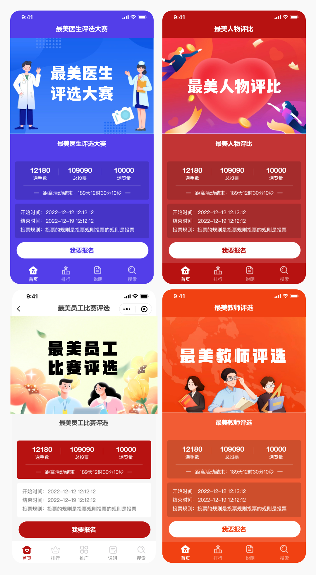 1.最美医生评选大赛,2.最美人物评比,3.最美员工比赛评选,4.最美教师评选