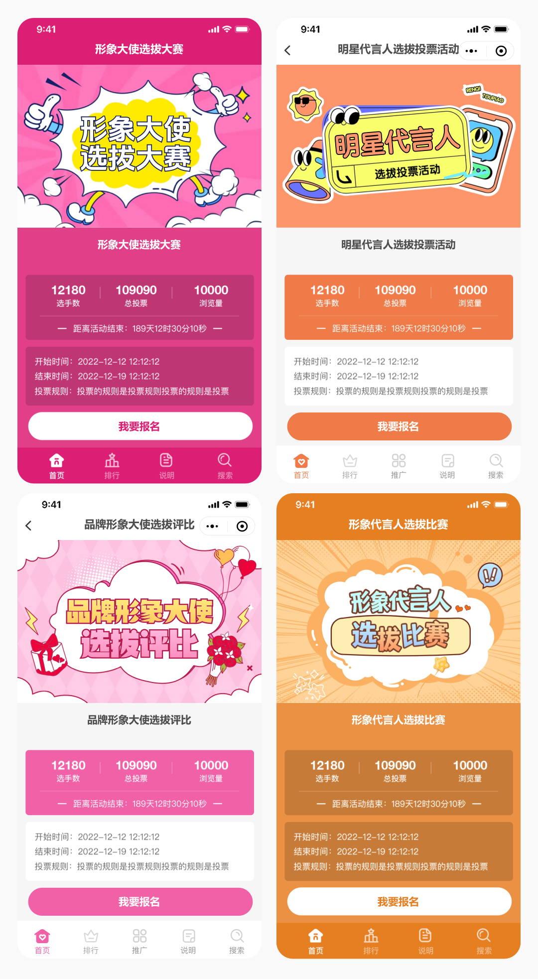 上面4套主题适合形象大使选拔大赛评选活动,同时也可以找到客服帮您制作好看的封面来适合更多的校花校草相关的评选大赛活动。