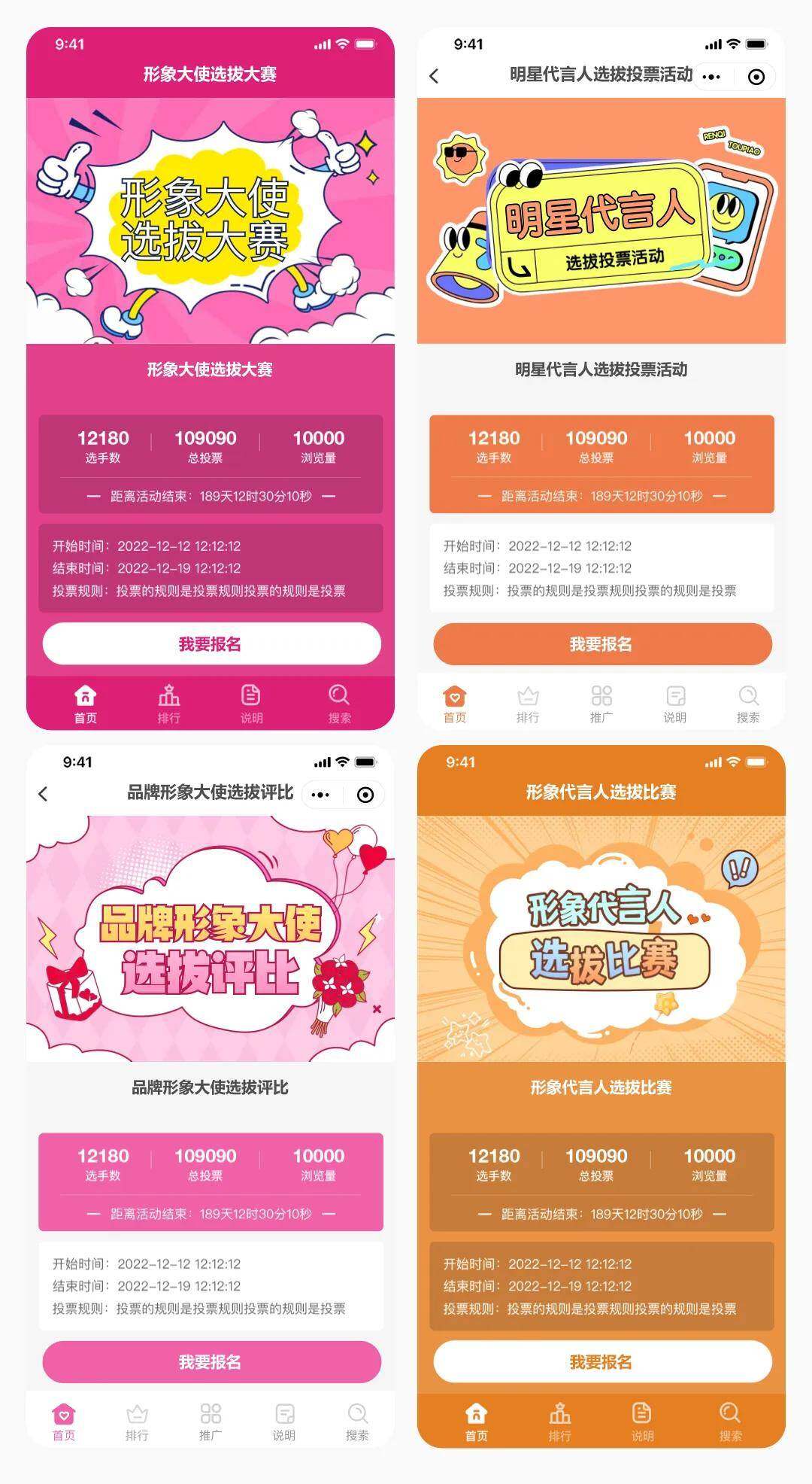 上面4套主题适合形象大使选拔大赛评选活动,同时也可以找到客服帮您制作好看的封面来适合更多的校花校草相关的评选大赛活动。