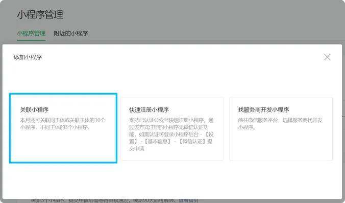 在公众号后台,广告与服务-》小程序管理中。点击关联小程序。