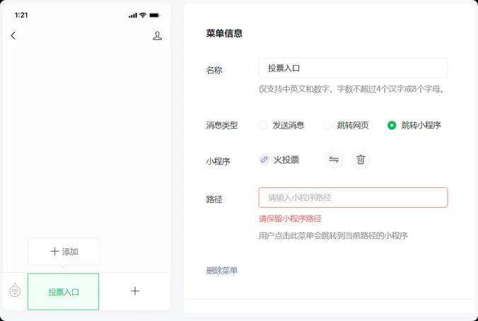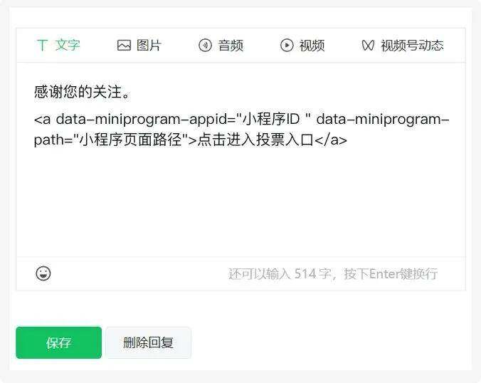 同样设置关键词回复相关规则,复制上述代码,同时填写小程序ID以及页面路径。即可完成。
