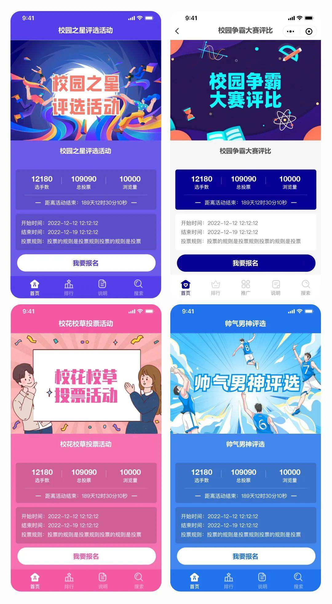 上述4个主题包括,校园之星评选,校园争霸大赛评比,校花校草投票活动,帅气男神评选等学校校园相关主题投票模板。您也可以联系客服帮您免费制作。