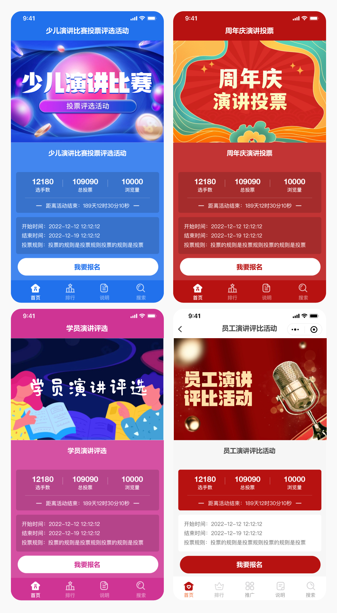 1.少儿演讲比赛,2.周年庆演讲投票,3.学员演讲评选,4.员工演讲评比活动