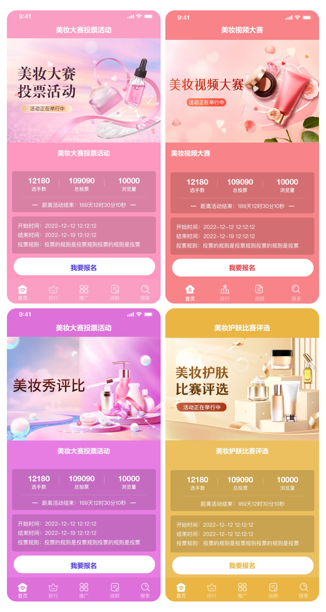 上面4套主题适合美妆大赛投票评选活动,同时也可以找到客服帮您制作好看的封面来适合更多和美妆大赛相关的投票评选活动。