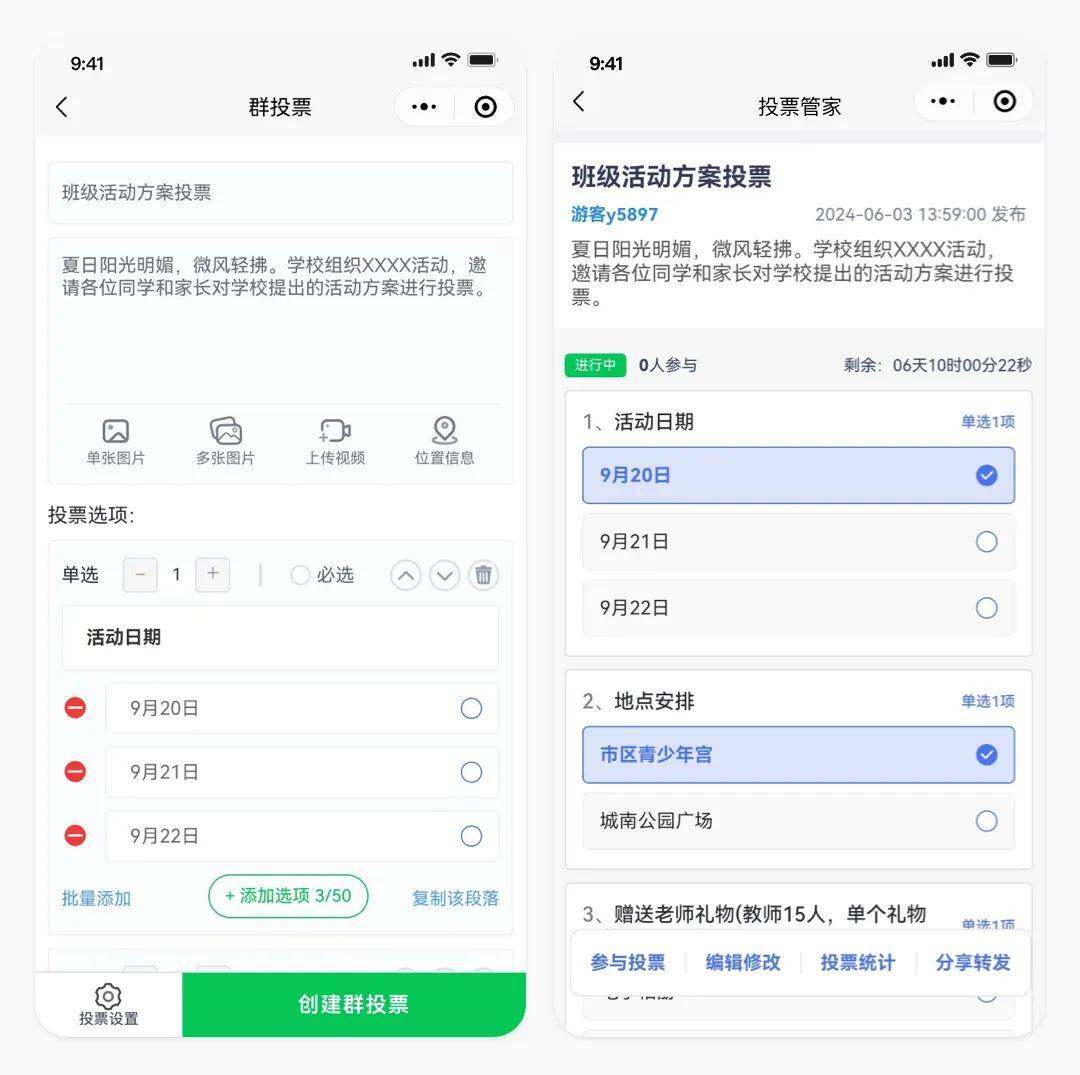 现在很多学校都会组织一些活动,比如服装购买,户外活动等。通过投票班级成员可以对不同的活动方案进行比较和选择,筛选出最受欢迎、最具可行性的方案。这种过程有助于优化活动方案,提高活动的质量和效果。投票过程有助于班级成员在活动方案上达成共识,减少分歧和矛盾。当大部分成员都支持某个方案时,这个方案就更容易得到顺利实施,从而提高活动的成功率。传统方式需要电话或微信群通知收集家长意见。现在给您介绍使用投票管家小程序 快速发起班级、学校活动方案投票。