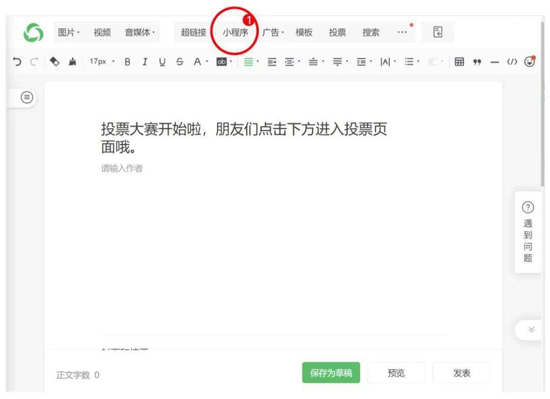 公众号后台:内容与互动-》草稿箱发表文章时 输入标题和作者后,点击上方小程序文字按钮。
