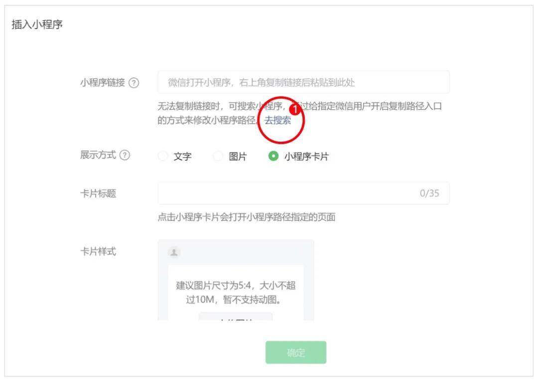 进入插入小程序页面,点击去搜索 点击 文本框下方常用内的小程序名字。