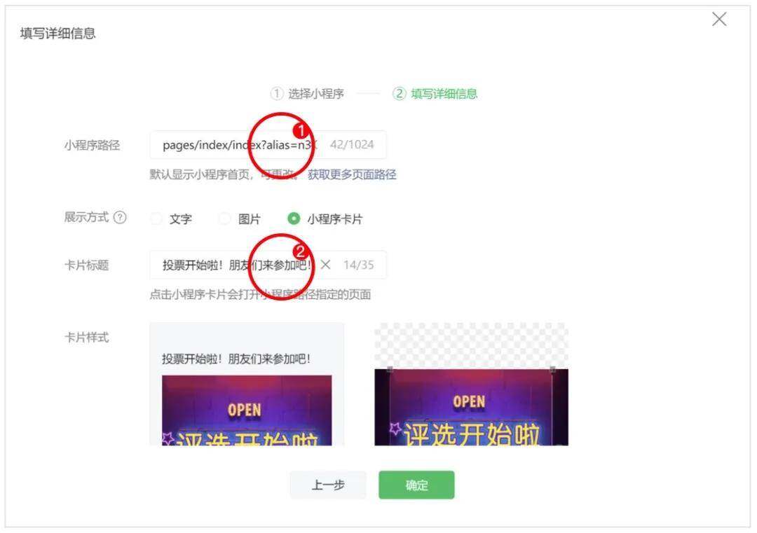 分别修改小程序路径和卡片标题,并上传相关图片。