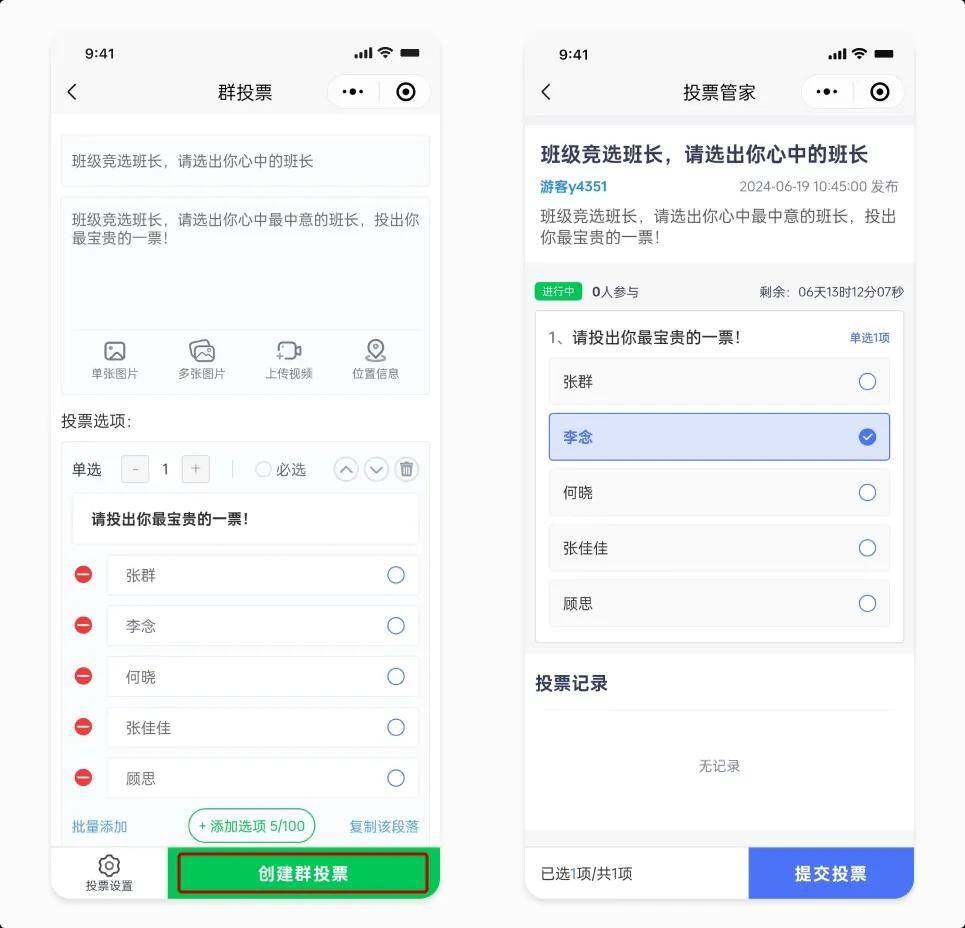 很多班级都会举行班长竞选,竞选班长是一个展示和锻炼学生领导能力的机会。在竞选过程中,学生需要展现自己的组织能力、沟通能力、决策能力和团队协作能力,这些能力对于未来的学习和工作都是非常重要的。老师在举行班级竞选活动时,应该怎样快速收集班级成员的意见呢?这时候就该用到投票小程序,下面给大家介绍一款免费的小程序:投票管家,投票管家里面有群投票功能,非常适用于班级竞选班长,以下是投票管家创建班级竞选班长群投票的制作教程,投票管家小程序只需要3步制作,大家可以慢慢收藏观看。