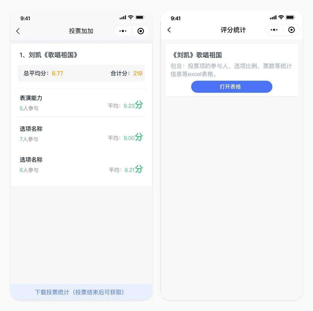 总平均分:为所有参与者对各评分项评价的平均值,精确到小数点后2位,方便创建者进行百分制计算。