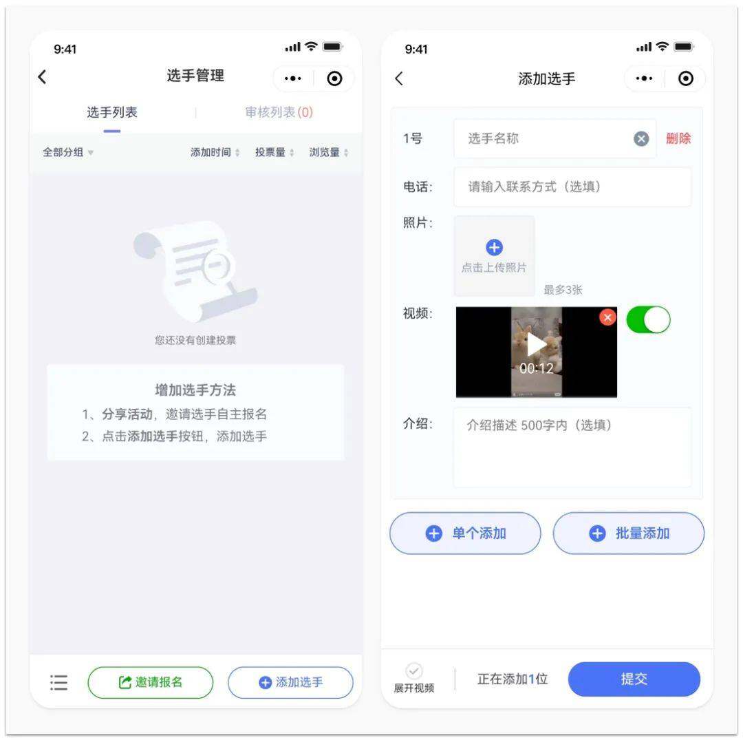 同时支持选手报名和创建者批量添加