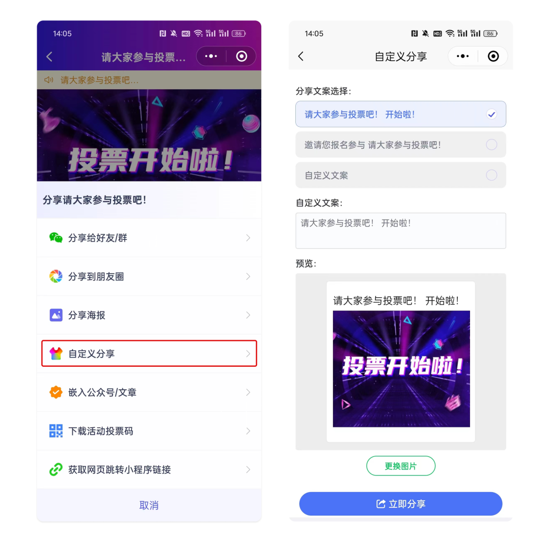 4.点击自定义分享,您可以自定义分享文案,小程序下方还有自定义预览模式,创建完成后这样就可以把投票链接分享到群里了。