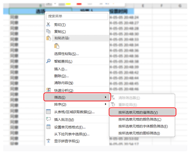 2、列头(蓝色背景)右键一》筛选-》按单元格的值筛选。