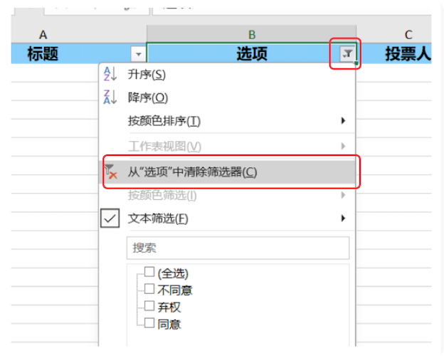 3、点击列头(蓝色背景)后漏斗图标一》从“xx”中清除筛选。