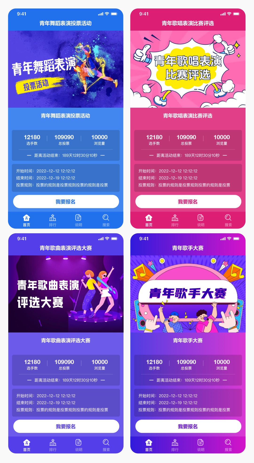 上面四个主题包括:青年歌手大赛,青年歌曲表演评选大赛,青年歌唱表演比赛评选,青年舞蹈表演投票活动,您可以选择其他模式主题,更换效果图既可以适合不同场景。