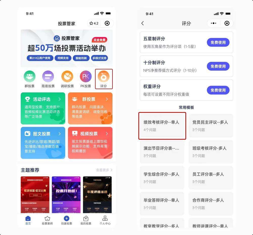 2、在首页选择评分投票,投票管家新推出的评分投票功能:里面有很多评分投票模板,选择绩效考核评分。