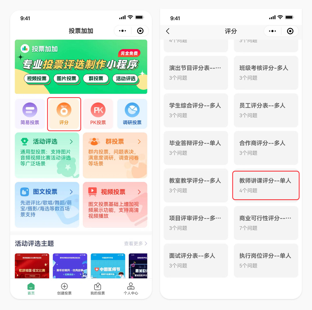 2.在投票加加小程序首页 选择评分投票,投票加加新推出的评分投票功能:里面包含了很多种评分投票模板,选择教师教学评分表。