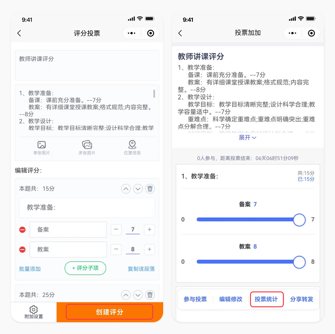 3.编辑评分投票的基本设置,如:投票选项、评分选项等。参与者只需要对每个选项进行打分,然后点击创建评分,创建者设置每项评分的满分,参与者根据情况进行评分。