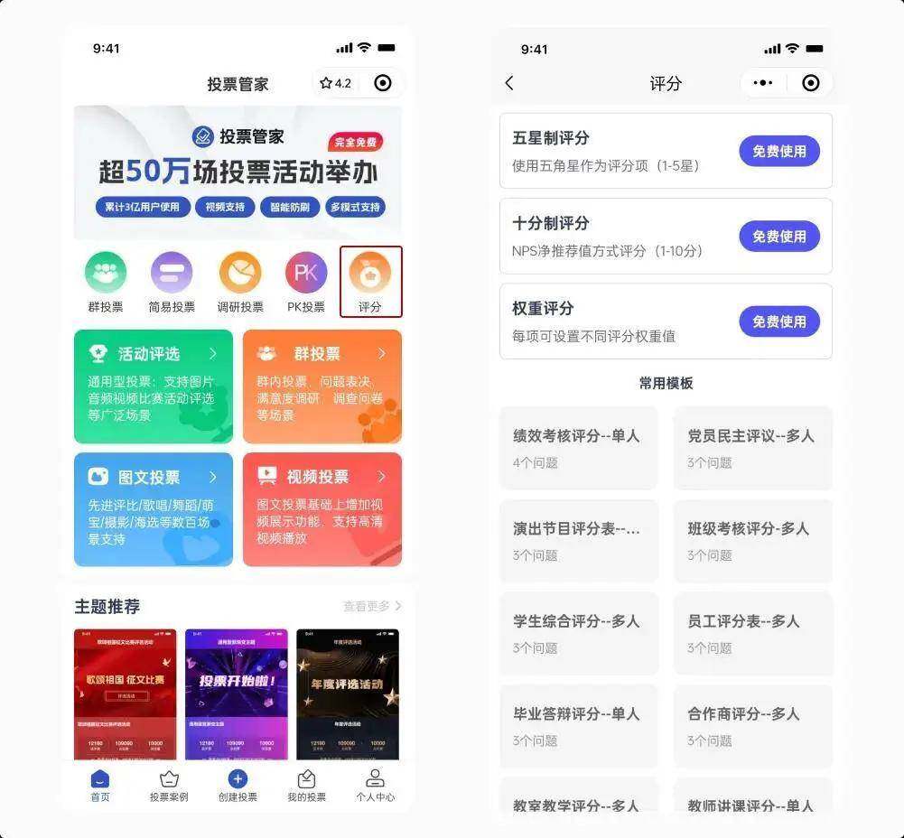 1、在投票管家小程序中 选择 评分投票,在这个功能里面,用户可以进行权重评分,也就是每项可设置不同评分权重值。评分投票里面还有各种常用模版,用户可以直接拿来使用。