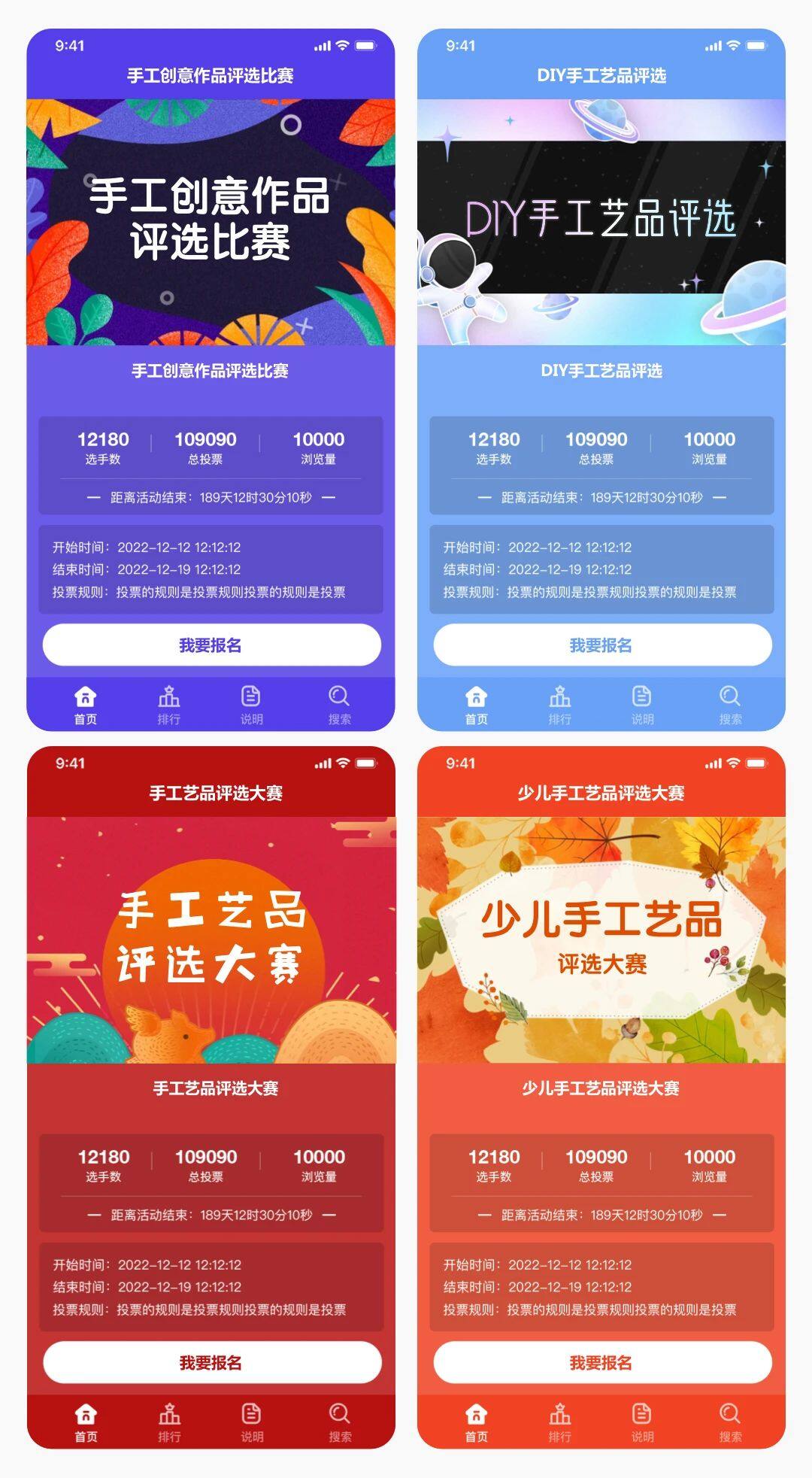 上面4套主题:手工创意作品评选比赛、DIY手工艺品评选、手工艺品评选大赛、少儿手工艺品评选大赛,适合手工艺品评选大赛,同时也可以找到客服帮您制作更多好看的封面来适配更多和手工艺品评选大赛的相关活动。