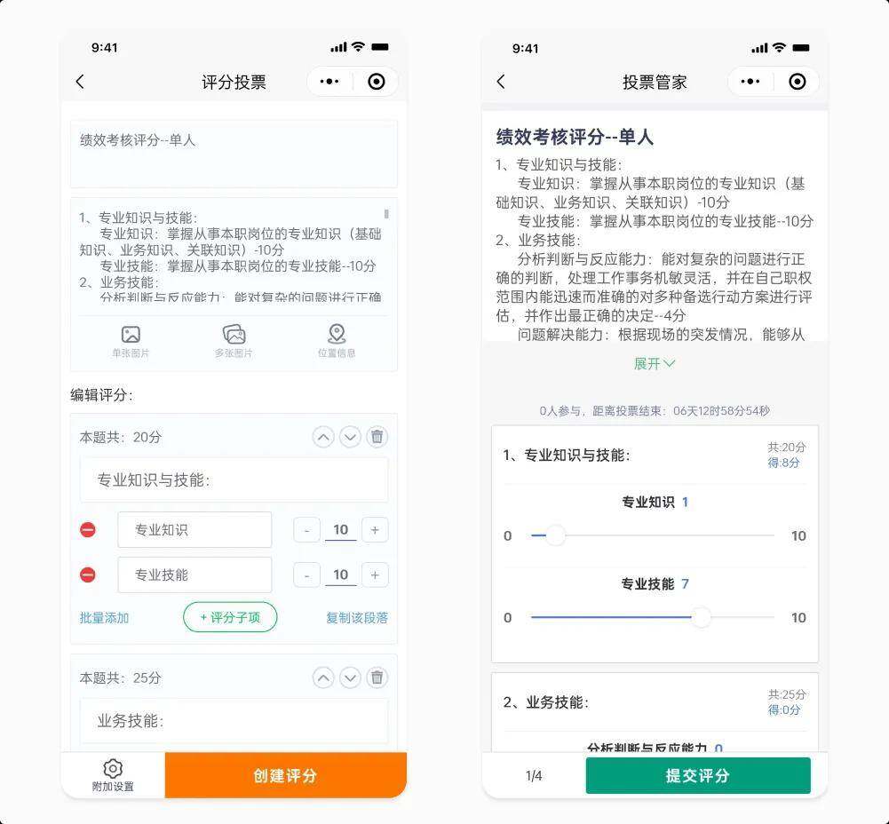 2、在首页选择评分投票,投票管家新推出的评分投票功能:里面有很多评分投票模板,选择绩效考核评分。