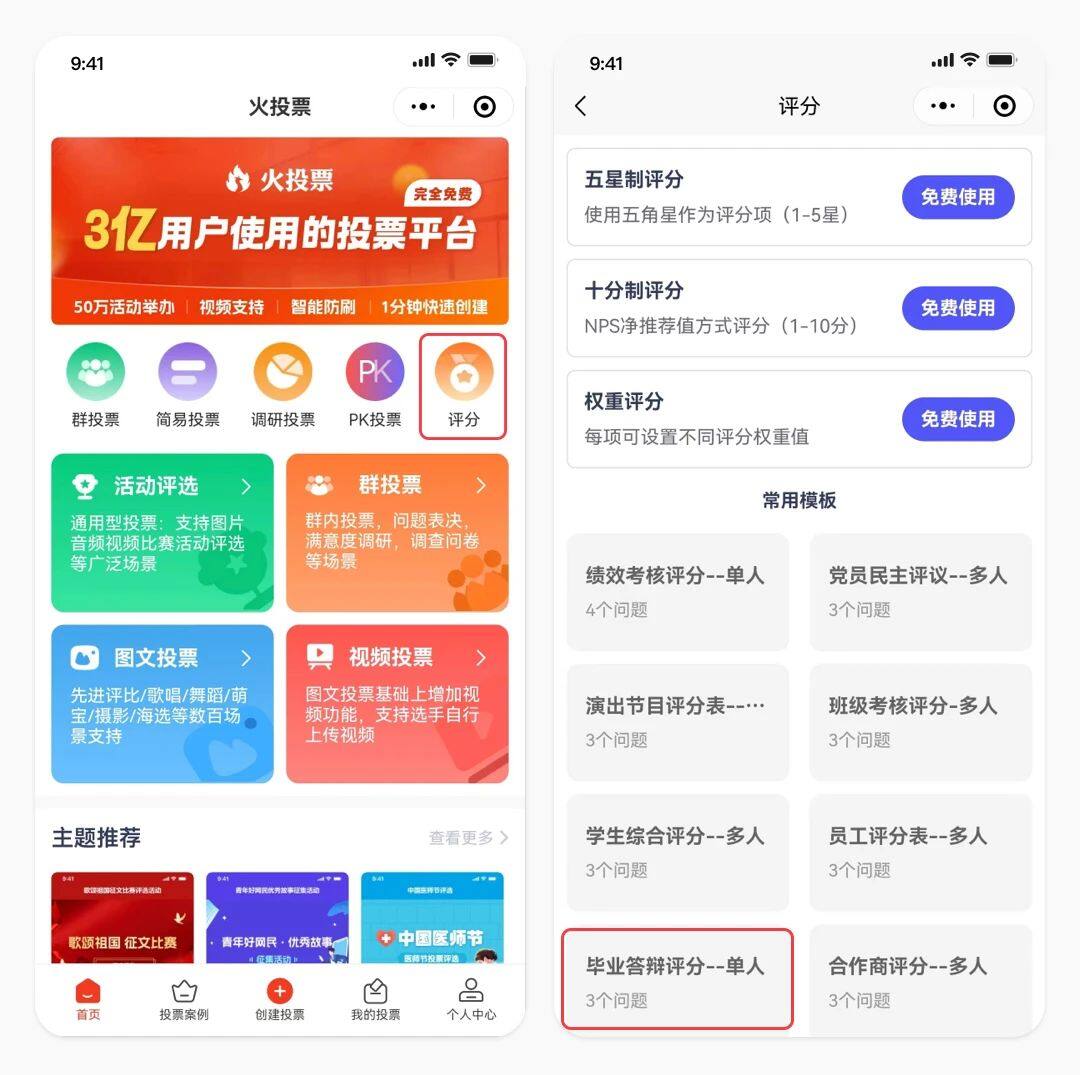 2.进入小程序首页 火投票新推出的评分投票功能:里面包含了很多种评分投票模板,选择毕业答辩评分。