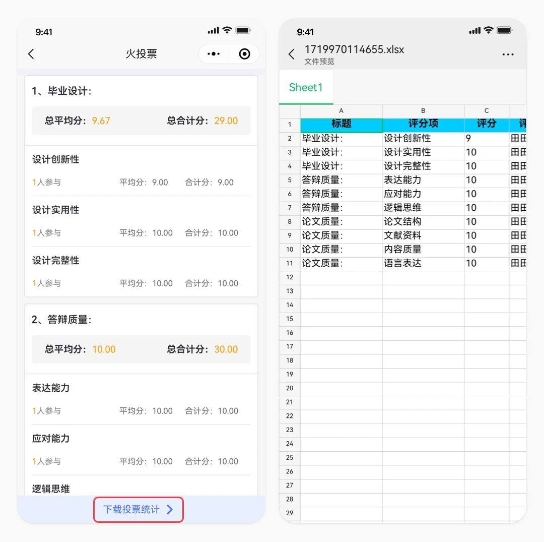 4.小程序支持投票统计表下载,创建者在投票结束后,点击投票统计,再点击下载投票统计,投票统计就保存到您的手机了。