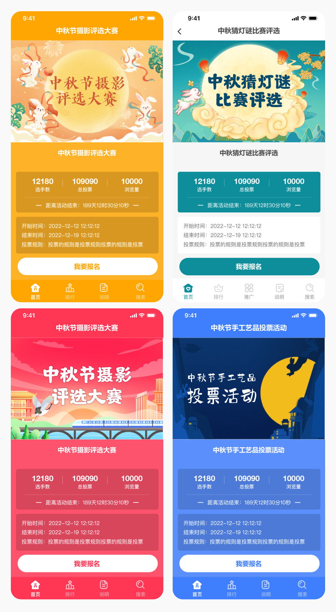 上面4套主题适合中秋节诗词朗诵比赛评选活动,同时也可以找到客服帮您制作更多好看的封面来适配更多和中秋节诗词朗诵比赛评选活动的相关活动。