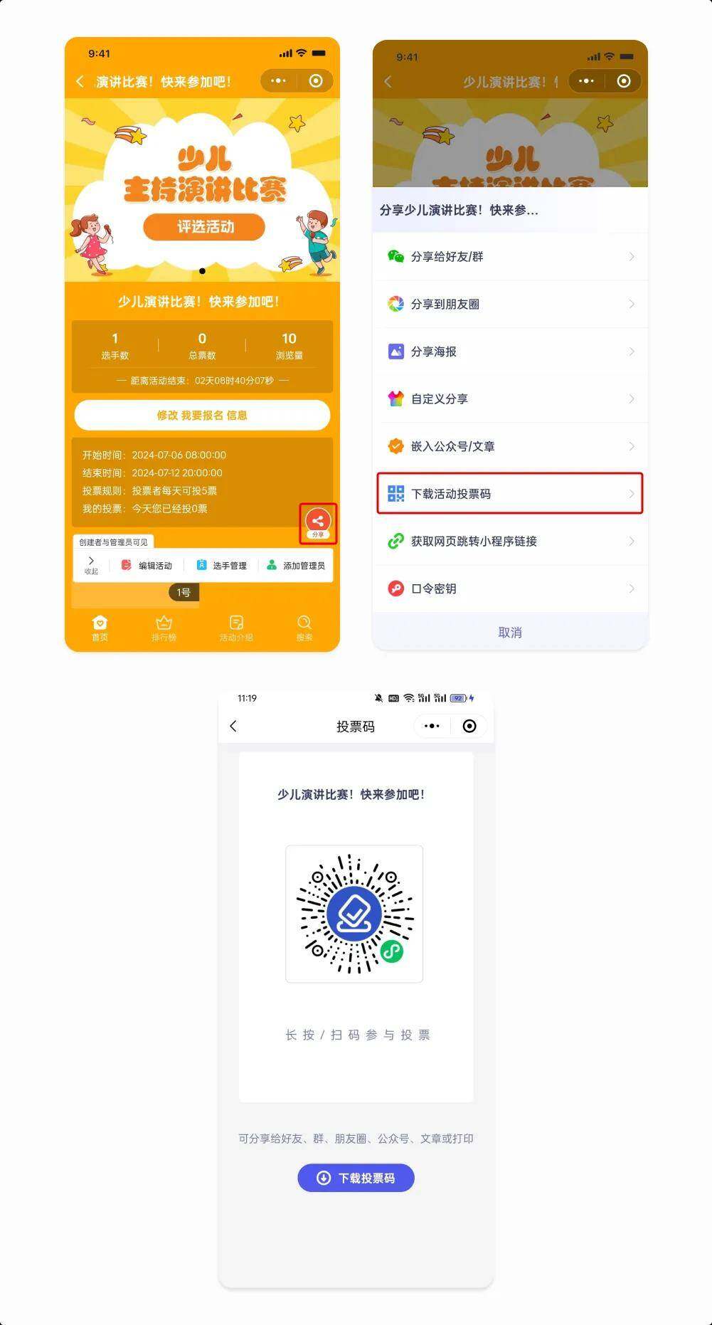 4、下载活动投票码,这样就会生成投票二维码,下载投票二维码,把二维码分享到群里或朋友圈,参与者直接扫码就能参加了。同时转发好友就会生成投票链接。
