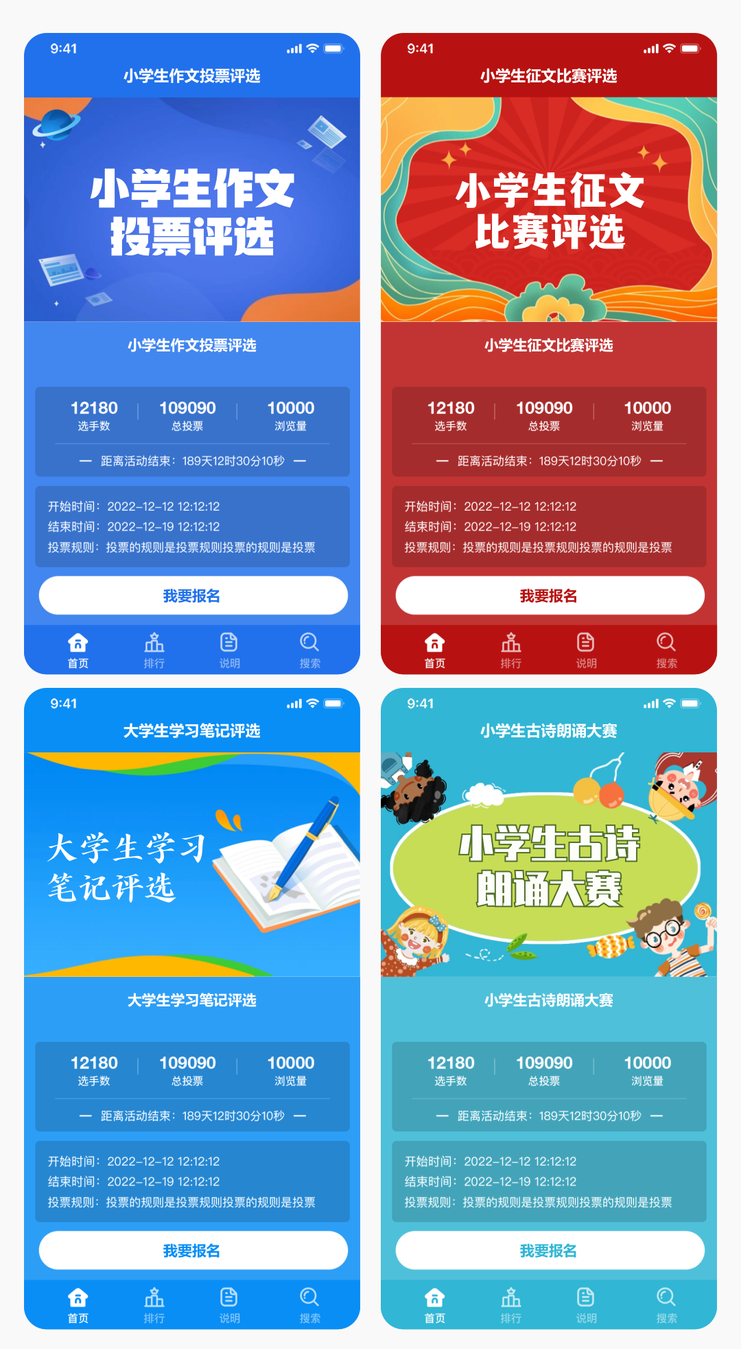 上面4套主题适合:小学生作文投票评选、小学生征文比赛评选、大学生学习笔记评选、小学生古诗朗诵大赛,同时也可以找到客服帮您制作更多好看的封面来适配更多和小学生征文比赛的相关活动。
