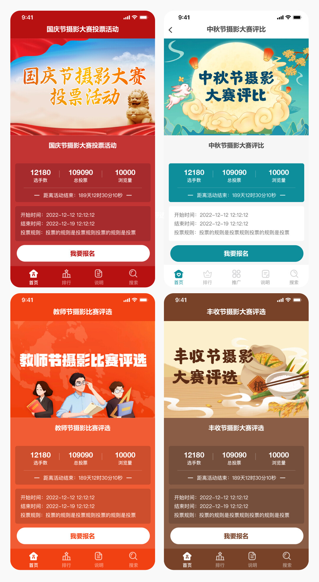 以上4套主题适合:国庆节摄影大赛投票活动、中秋节摄影大赛评比、教师节摄影比赛评选、丰收节摄影大赛评选,同时也可以找到客服帮您制作更多好看的封面来适配更多和丰收节摄影大赛评选活动的相关活动。