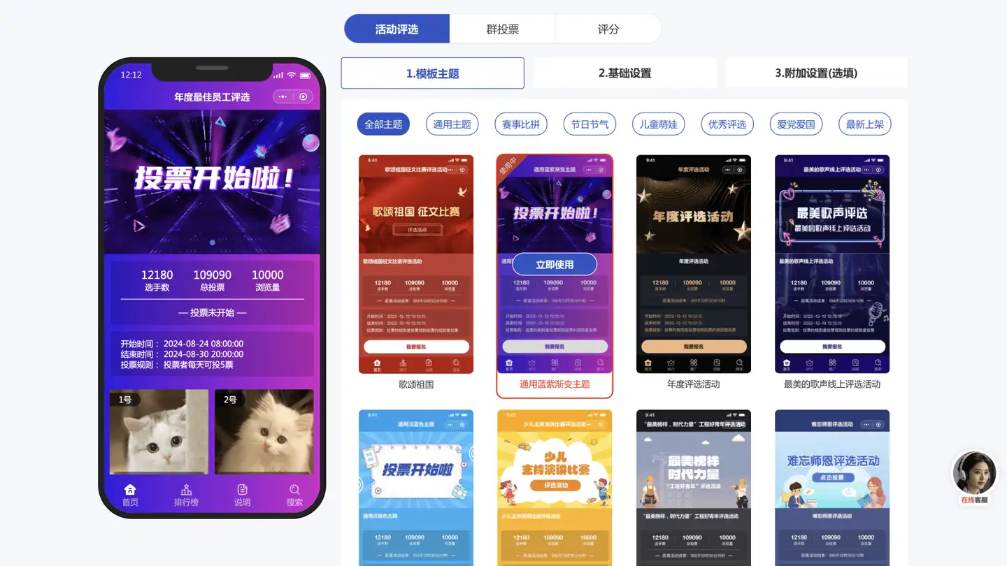 2.进入投票管家小程序首页或PC端网站选择活动评选,在活动评选中选择任意一个模板(模板均为通用场景)