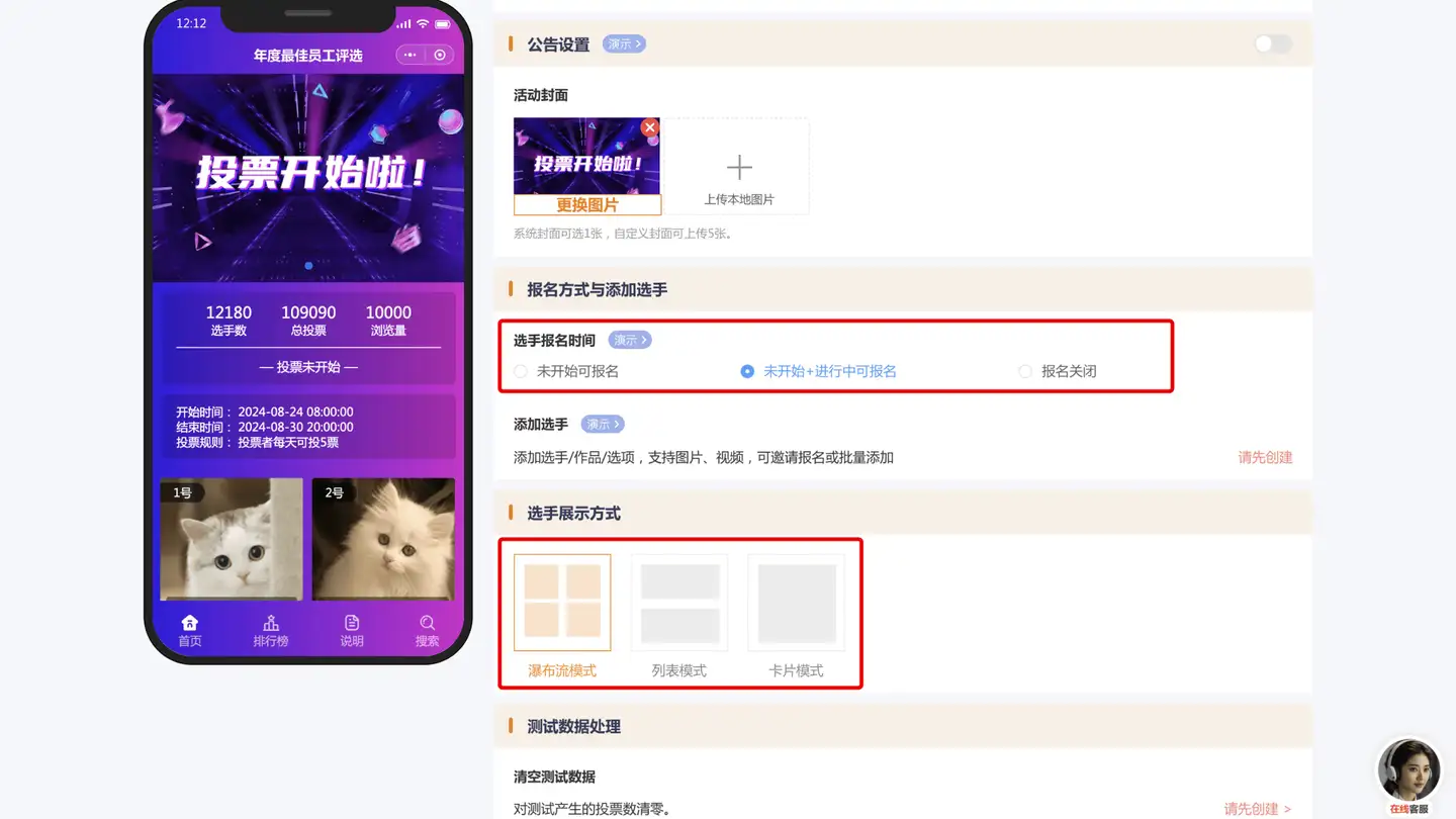4.设置选手报名时间,上传选手图片,添加选手/作品/选项,支持高清图片、视频,可邀请报名或批量添加。