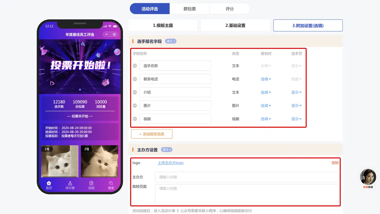 5.点击附加设置填写选手报名信息,如:选手名称,联系方式,选手介绍等。同时,还支持活动主办方设置,上传主办方图片logo等功能。