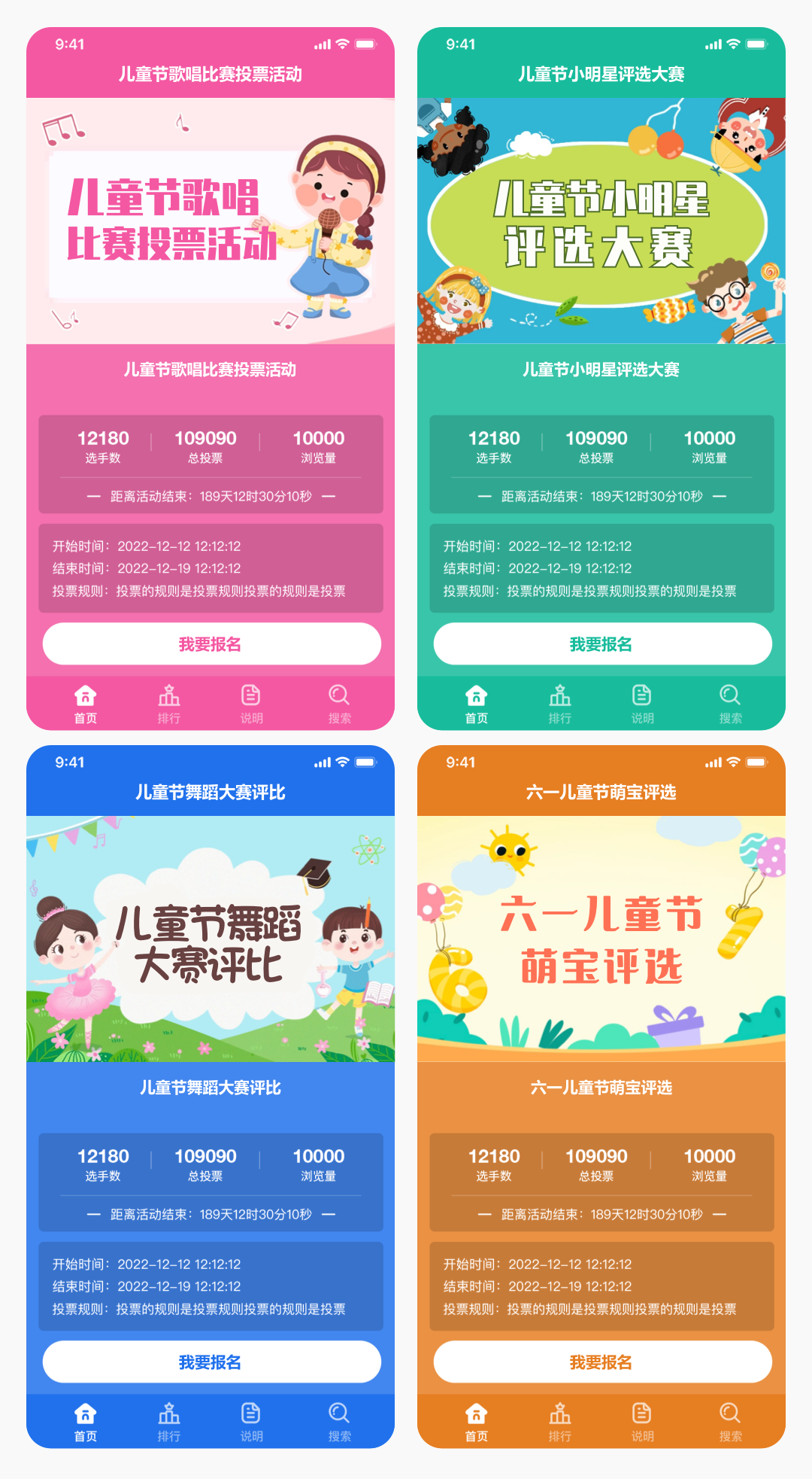 上面4套主题适合六一儿童节萌宝大赛评选活动,同时也可以找到客服帮您制作好看的封面来适合更多的六一儿童节萌宝大赛相关的投票活动方案。