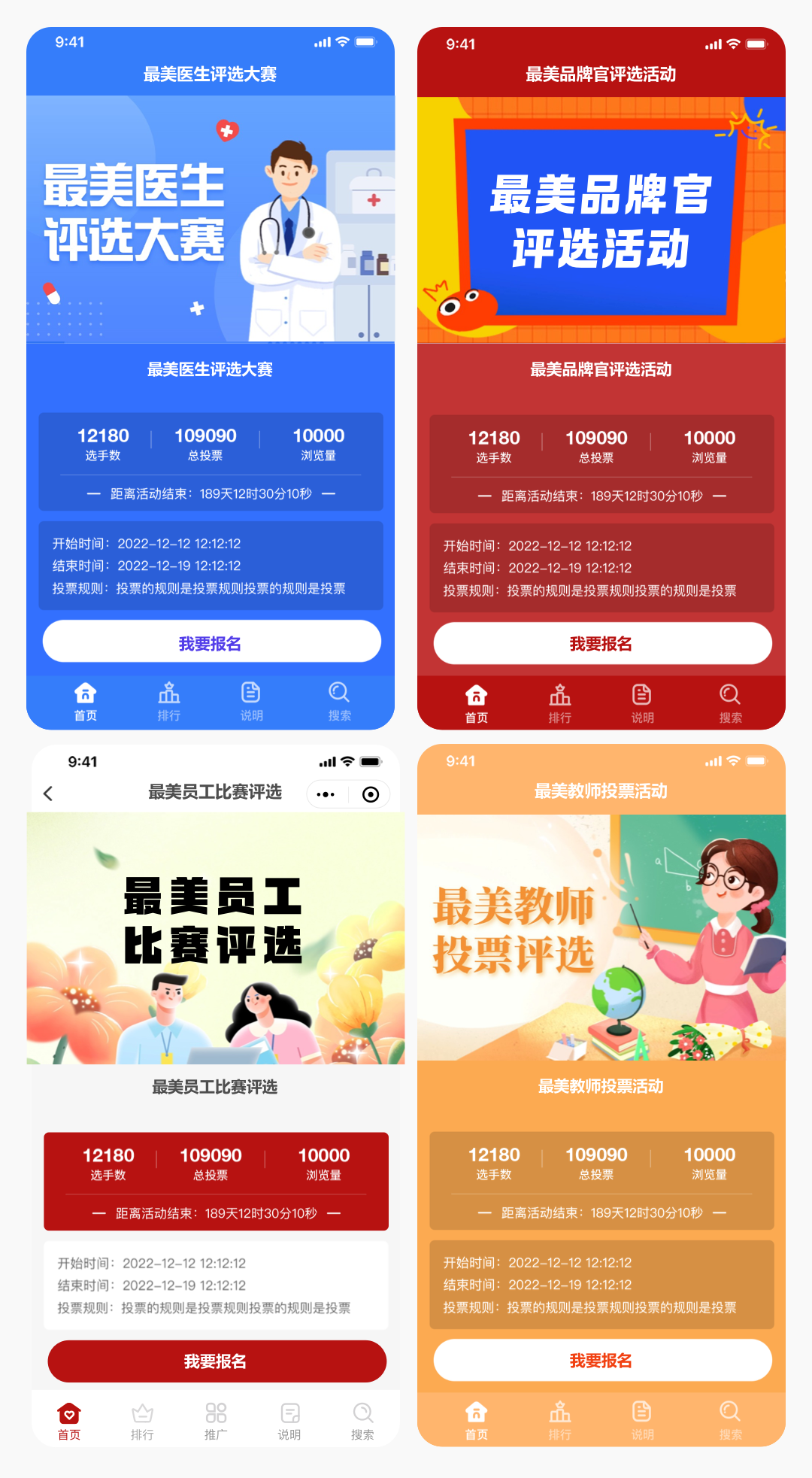 一家企业或品牌为了推广自己的产品,很多会通过发起评选活动来提升自己产品的曝光率,最美品牌官评选活动就可以达到推广效果。这项活动能够增强企业对品牌管理的重视程度。活动让企业意识到优秀品牌官对于企业品牌塑造和发展的关键作用,从而加大对品牌管理的投入和支持。通过举办最美品牌官评选活动,也能提升企业品牌的知名度和美誉度。一般最美品牌官评选活动有以下类型:最美品牌官评选活动,最美教师投票活动,最美医生评选大赛,最美员工比赛评选等。另外还会有很多和最美品牌官评选相关的投票活动。