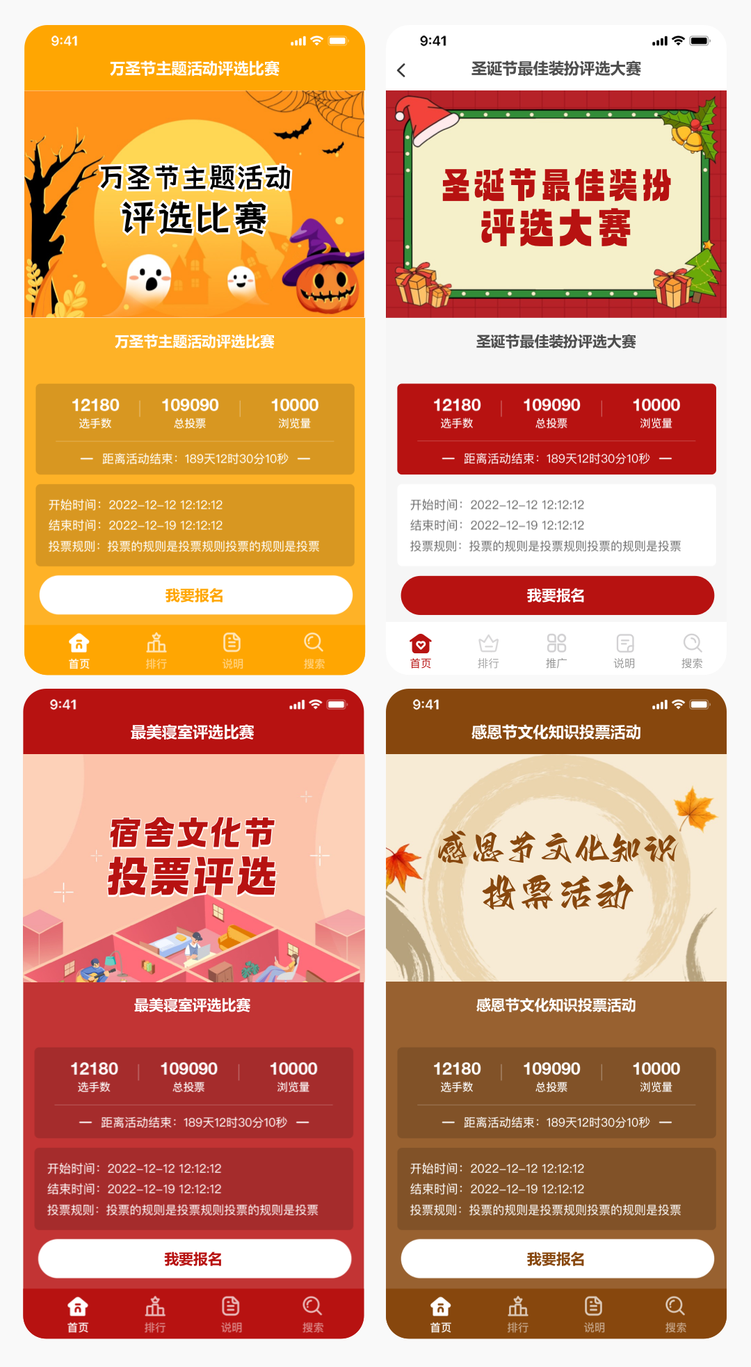 以上4套主题适合:万圣节主题活动评选比赛、圣诞节最佳装扮评选大赛、宿舍文化节投票评选、感恩节文化知识投票活动,同时也可以找到客服帮您制作更多好看的封面来适配与宿舍文化节评选活动相关的活动。