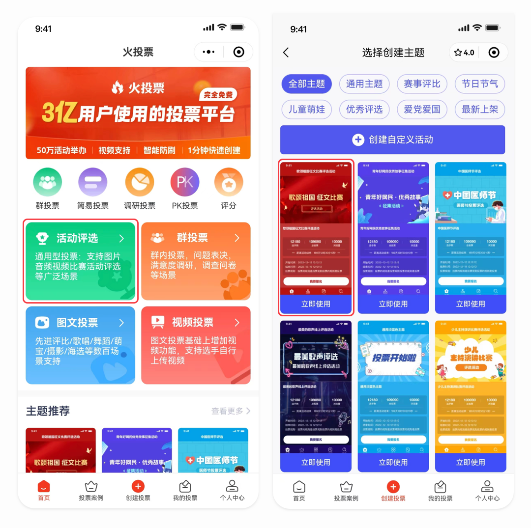 2.进入 火投票 小程序 选择投票模式,然后点击您喜欢的投票模板。